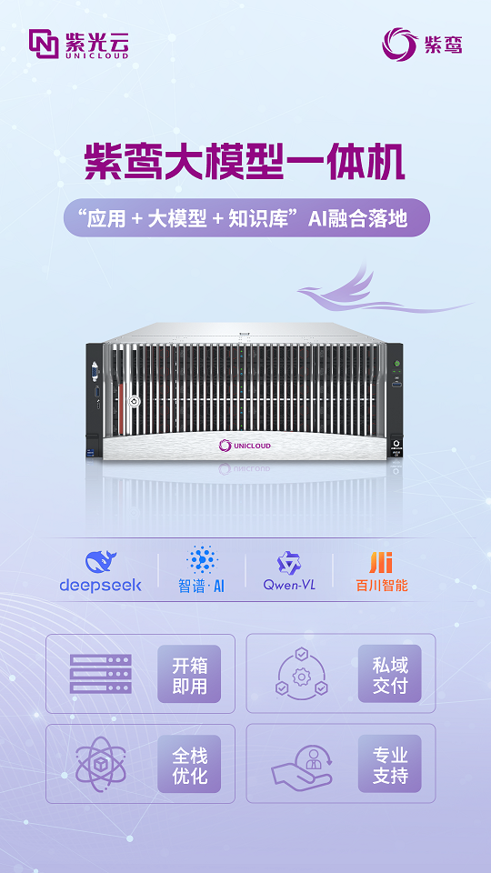 新紫光集团旗下紫光云推出的紫鸾大模型一体机,现已全系优化适配并预制DeepSeek R1系列推理模型,支持英伟达,天数,昆仑芯,燧原科技等异构芯片的统一调度 91香蕉,通过一体化开箱即用私域部署,紫鸾大模型实现了DeepSeek的无忧部署,为政企用户提供高性价比的生产级AI解决方案,打造安全高效的智能方舟。